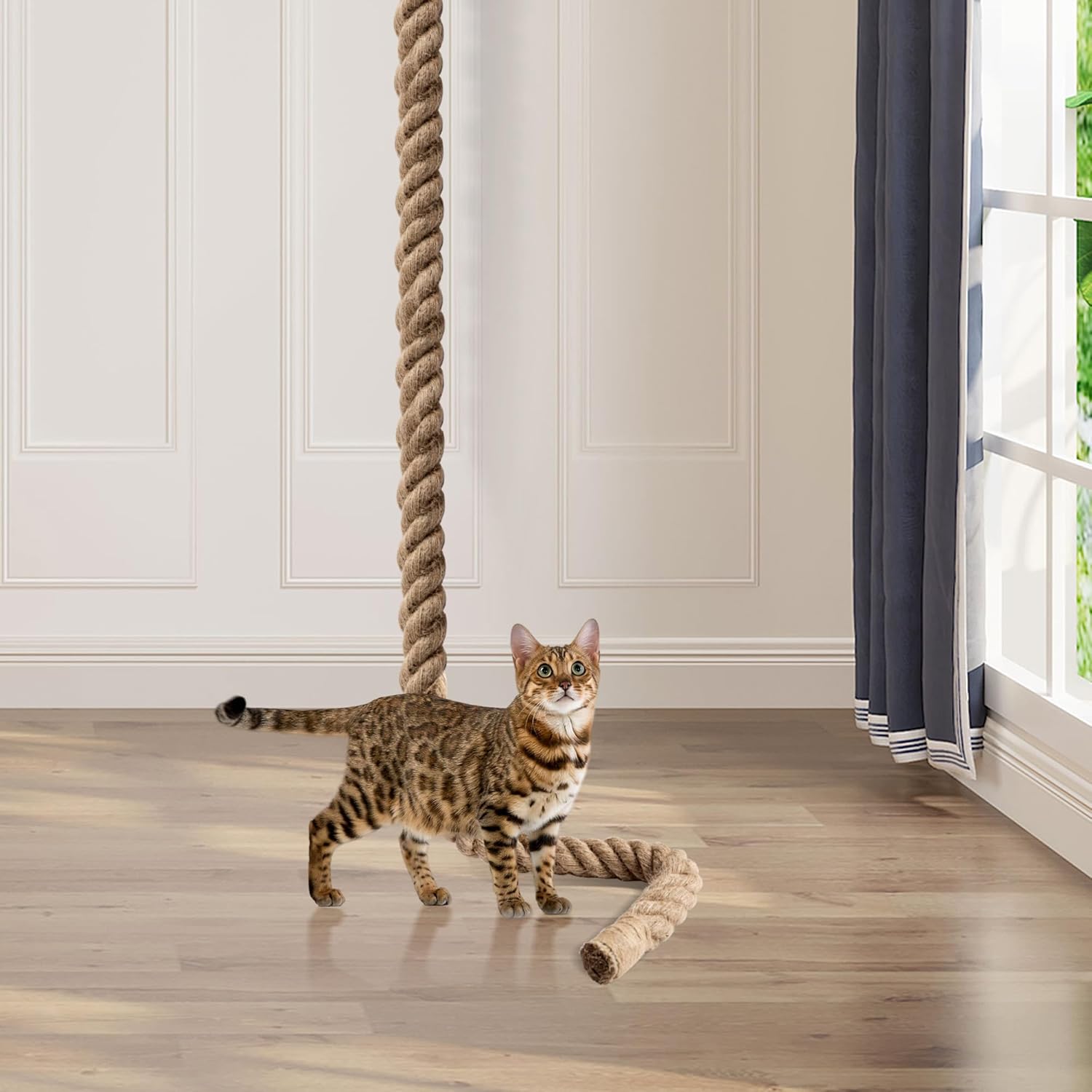 Size & Strength: 2-Inch Diameter x 3M/9.84Ft Cat Climbing Rope – Thicker and longer than standard ropes for enhanced stability, supporting cats of all sizes. Natural jute fiber resists scratching damage for long-term use. Easy Ceiling/Wall Installation: Includes heavy-duty carabiner, hooks, and screws – Securely mount to ceilings or walls in minutes. Reinforced design holds up to 50 lbs, ensuring safe vertical climbing and jumping. Interactive Feather Toy Included: Top-mounted green feather entices cats to climb, pounce, and play – Stimulates natural hunting instincts while reducing boredom-related furniture scratching. Durable & Cat-Safe Material: 100% natural jute fiber – Free from chemicals, splinters, or synthetic coatings. Rough texture satisfies scratching urges while protecting claws and paws. Space-Saving Cat Gym Alternative: Perfect for apartments or multi-cat homes – Replaces bulky cat trees by utilizing vertical space. Use indoors, outdoors (under shelter), or on catios for climbing, stretching, and exercise.
