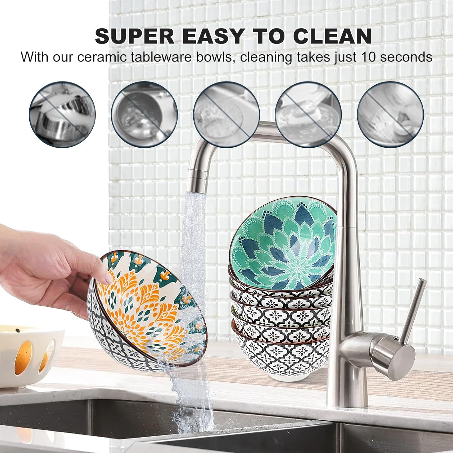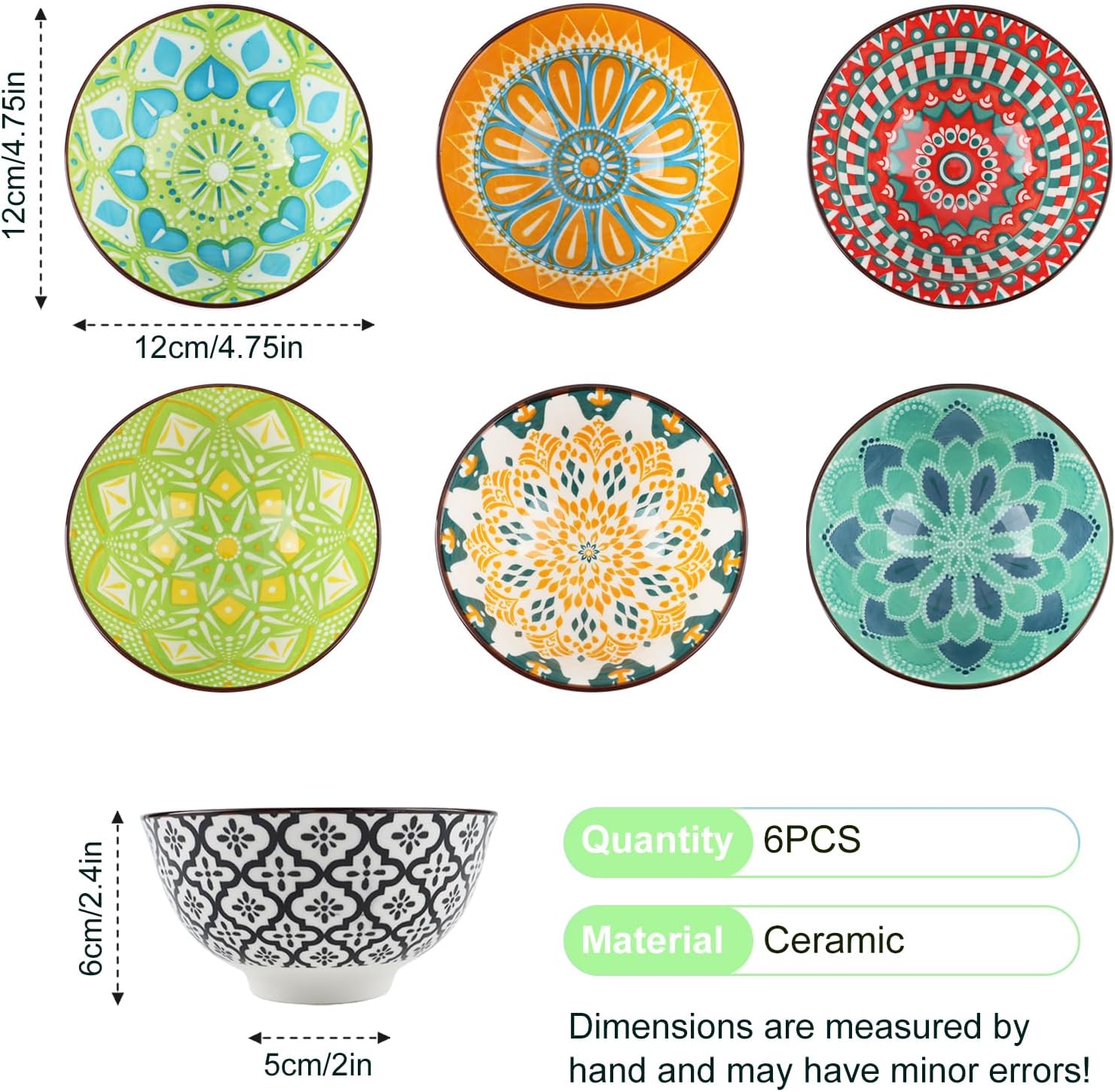 【10oz Size for Every Occasion】4.5”W x 2.4”H. Microwave-safe for reheating soups and oven-safe up to 350°F for baked dips. Tip: For safe use,Handle heated bowls with an insulating pad and allow to cool 1-2 minutes before touching to prevent burns. 【Easy Stacking and Cleaning】This Bowl set the underglaze colors are crystal-clear and smooth, making them a breeze to clean—just wipe with a damp cloth or rinse with water. Though dishwasher-safe, handwashing is recommended to preserve intricate patterns. Nestable design stacks neatly, saving 50% cabinet space. 【Food-Safe Materials】Made from premium high-fire ceramic, lead-free glazes. Features a vibrant, scratch-resistant finish that withstands heat and daily use—beautifully durable for years without fading. Safe for acidic foods like salsa or citrus fruits. 【Safe and Practical Design】For non-slip considerations,Soup bowls bottom of the bowl is not glazed,durable and stable,and will not hurt the countertop or hands.ideal for rice, cereal, noodle, soup, ramen, salad, dessert, fruit, snack, or dips, salsa and guacamole. 【Japanese Aesthetic】Hand-glazed blue/white geometric patterns elevate everyday meals. Neutral style ideal for holiday meals (Thanksgiving sides, Halloween treats), daily farmhouse, modern, or sushi-night themes use, and stylish pantry organization.