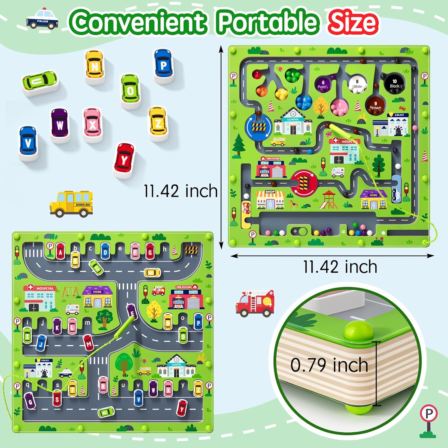 Car Alphabet Maze: The double-sided maze adopts the car theme elements. Children can recognize more animals and letters when playing with the board.Each animal has a letter. Use the magnetic pen to drag the animal to find the corresponding letter. Car Counting Maze: The car Number Maze has 10 different colors, corresponding to 10 different numbers, and the corresponding numbers have different numbers of small balls. Use the magnetic pen to drag the beads of different colors to find the corresponding small animals. Color classification, color recognition. Occasion: The car double-sided magnetic maze is suitable for boys and girls aged 3-5, 4-6, preschool, birthday gifts, party gifts, Christmas gifts, Halloween gifts, Valentine's Day gifts, etc. Educational Toys: The magnetic double-sided maze board can train children's hand-eye coordination and fine motor skills. Montessori toys can train children's thinking and problem-solving abilities. Best Material: The car Magnetic Maze is made of high-quality wood. Every bead and every letter is firmly fixed under the acrylic board, so there is no need to worry about it being scattered all over the floor. The smooth edges will not hurt children's fingers.