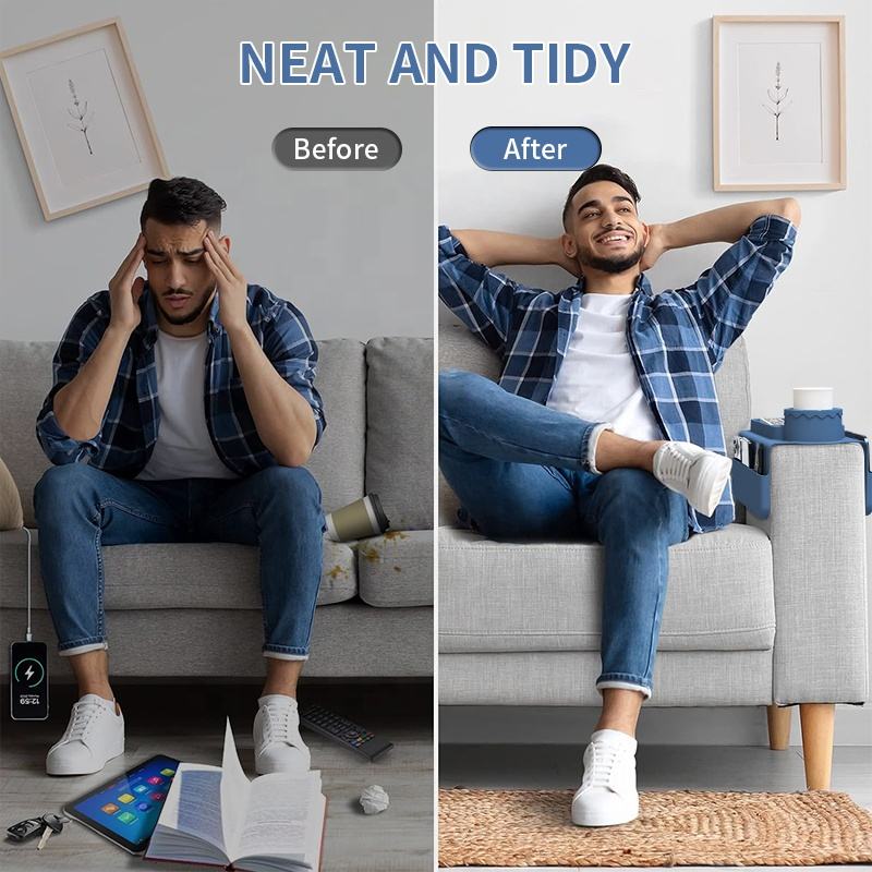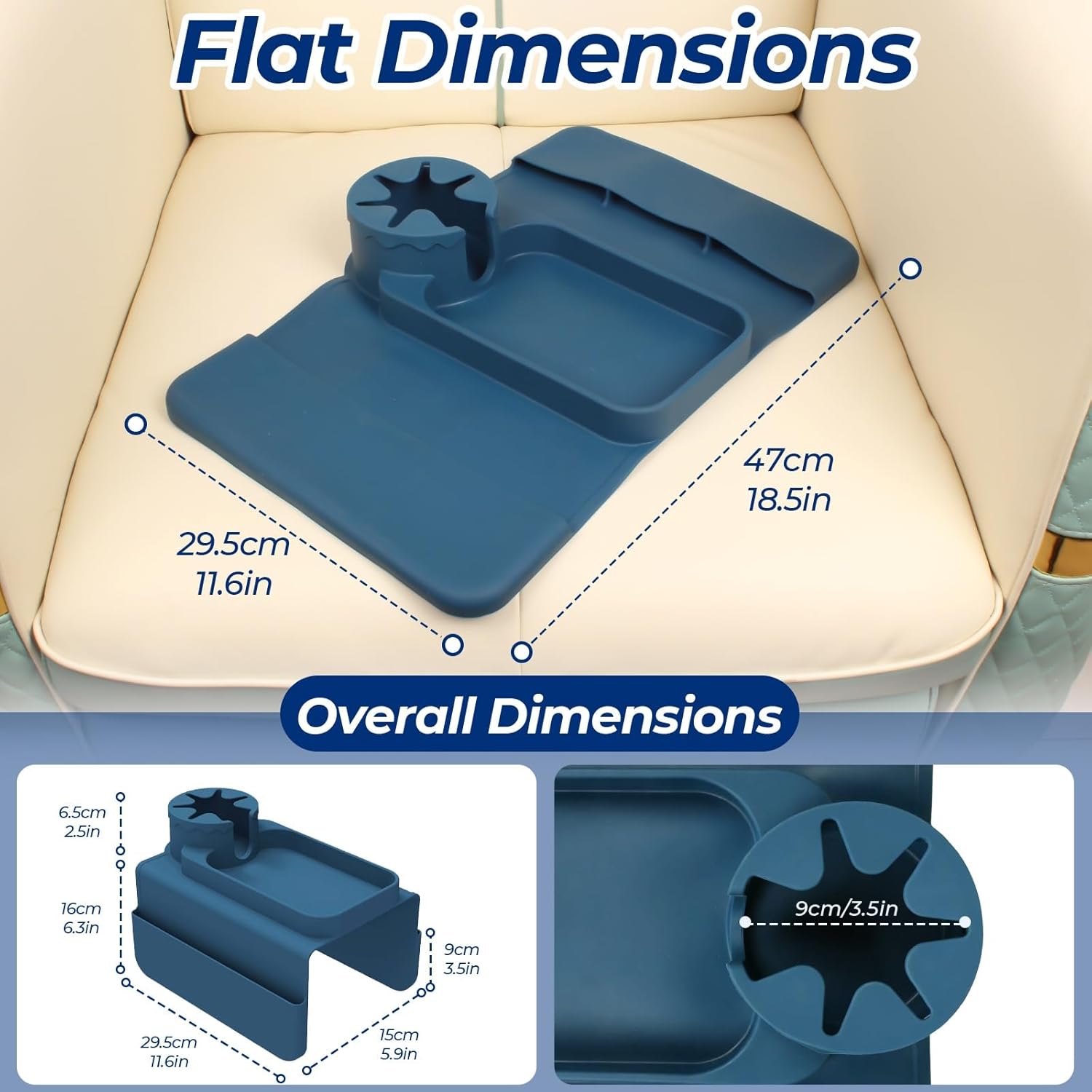 【NEVER SPILL AGAIN WITH GEAR-LOCK TECHNOLOGY】 Unlike standard cup holders that let drinks wobble, our unique star gear-shaped holder grips your mugs, tumblers, and bottles securely. The weighted design and non-slip base ensure your drinks stay upright even on plush or rounded sofa arms. 【MAXIMIZED 3-SIDE STORAGE CAPACITY】 Transform your sofa arm into a tidy command center. Featuring one extra-large compartment for tablets/books and three specialized pockets for remotes, glasses, and phones. Everything you need is within arm's reach, keeping your living space organized and clutter-free. 【UNIVERSAL FIT FOR ANY ARMREST】 Engineered with high-grade flexible silicone, this organizer stretches and contours to fit various sofa and chair armrests (from thin to thick). Perfect for home couches, office chairs, recliners, and even RV seats where space is at a premium. 【PREMIUM FOOD-GRADE SILICONE & EASY CLEAN】 Made from durable, BPA-free food-grade silicone, this tray is heat-resistant and built to last. No more worrying about stains or crumbs; simply wipe it down with a damp cloth or rinse it to keep it looking brand new. 【THE ULTIMATE GIFT FOR RELAXATION】 An essential accessory for movie lovers, gamers, and anyone who enjoys lounging. No assembly required—simply place it over the armrest and enjoy. It is a thoughtful and practical gift for birthdays, housewarmings, or daily convenience.