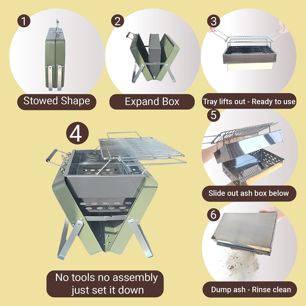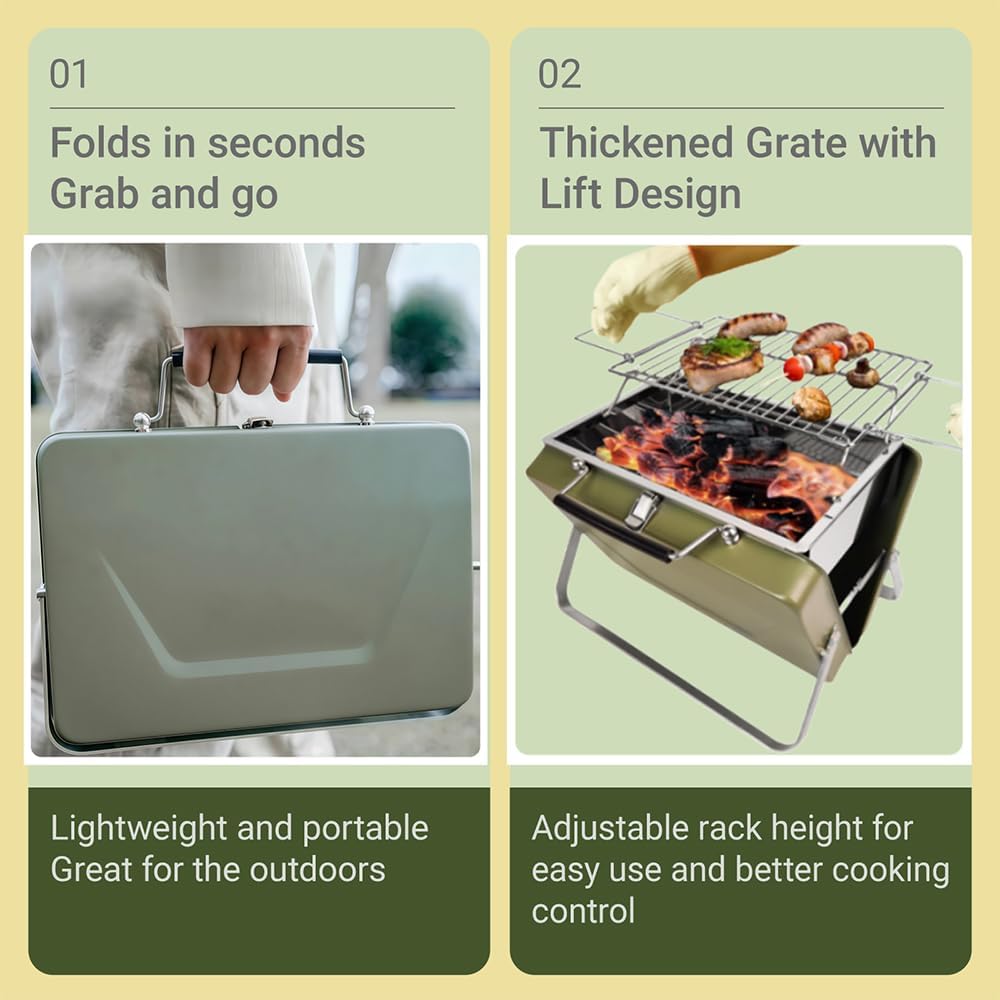Tool-Free, Fast Setup & Pack-Up:No tools required—unfold this folding grill, portable charcoal grill for camping, or outdoor grill and start cooking in seconds. Collapses back into suitcase form in five seconds—grab and go with your small BBQ or small outdoor grill.