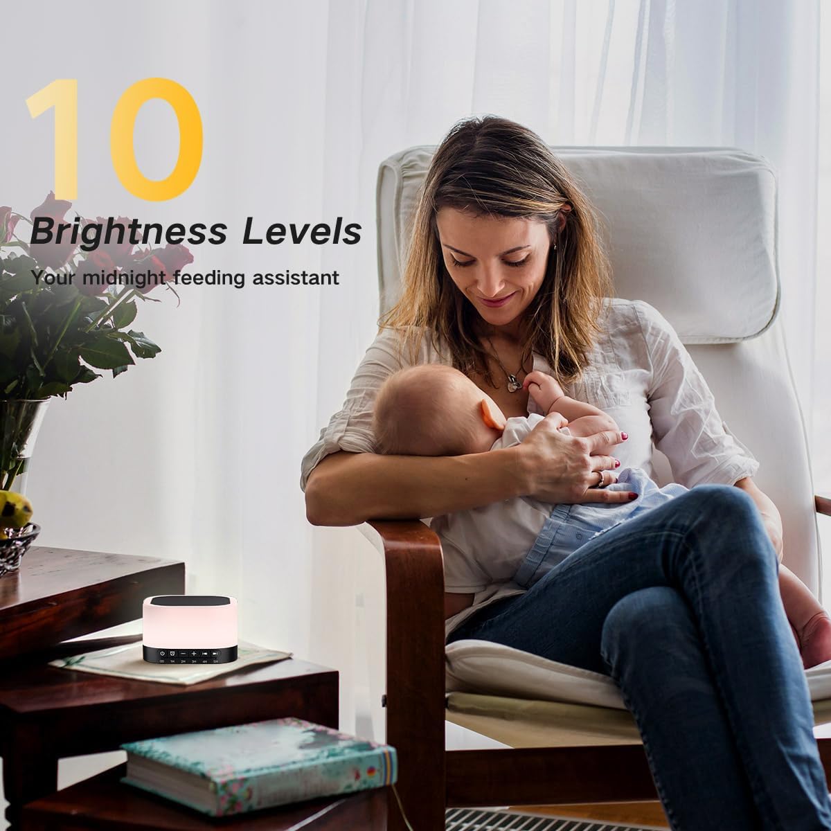 12 Night Light Colors & 10 Brightness Levels: You can choose the color according to your needs, such as red, purple, green, sky blue, lake blue, yellow, warm color, etc., you can also adjust the brightness of the light according to your feeding & sleep requirements. The comfortable colors devote to create a serene’s atmosphere for utmost relaxation and sleep. Let you indulge in the great blend of sound and visual therapy for a peaceful night's rest.
