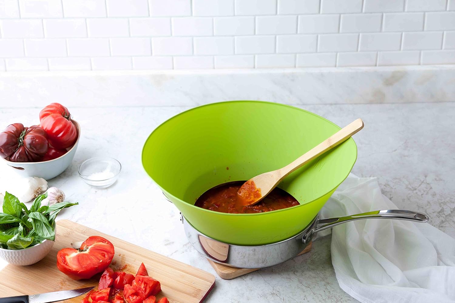 SPILLOVER STOPPER: Perfect for preventing spillovers when sautéing lots of veggies and greens in overfull pan.