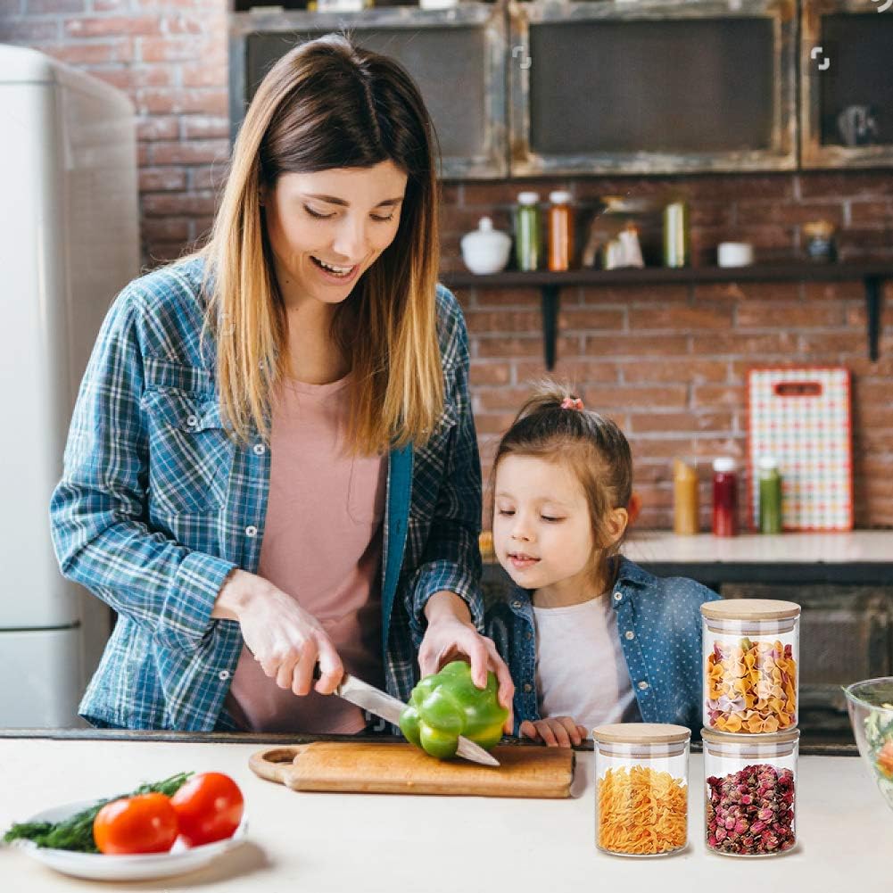 【12 Set 9OZ with 12 Pcs Labels】Set of 12 Glass Jars. Size:6.5x10cm, Capacity:9OZ/ 255ml. Come with 12 Pieces labels for labeling the storage food.I really like these beautiful little jars,12 small glass jars set can help you to sort and store a lot of items and make your room clean and beautiful.(Please Note: The spice jars is very small, just perfect for some spice and small accessories, If you wanna big size, it is not suitable.) 【High Quality Materials】The airtight glass jar set is made of food-grade high borosilicate glass, 100% lead-free.These cute glass containers are thicker than other jars.There is a silicone ring on the bamboo lid that will not make a sound and scratch the jar when the lid is opened.This glass storage tank can be heated to 150 degrees Celsius with an open flame or frozen to minus 20 degrees Celsius. 【Keep Freshness & Moistureproof】The bamboo wood lids with all-round silicone sealing loop creates an airtight and moistureproof environment to keep your the contents fresh and dry. Looks great, too. 【Easy to Clean】The crystal glass allows you to see what is inside and easily monitor whether your food has run out. Yibaodan Glass storage containers can be placed in the dishwasher for cleaning and placed in the refrigerator and microwave, while wooden lids can be wiped with cloth. 【Widely Application】Our bamboo cover is sealed with a rubber ring for high confidentiality, perfect for storing wet (gravy / jam / cut fruit) or beans, baked goods (flour / powder / salt / sugar), biscuits, cereals, tea and spices or other ingredients. It not only stores food well, but also saves space in the kitchen.