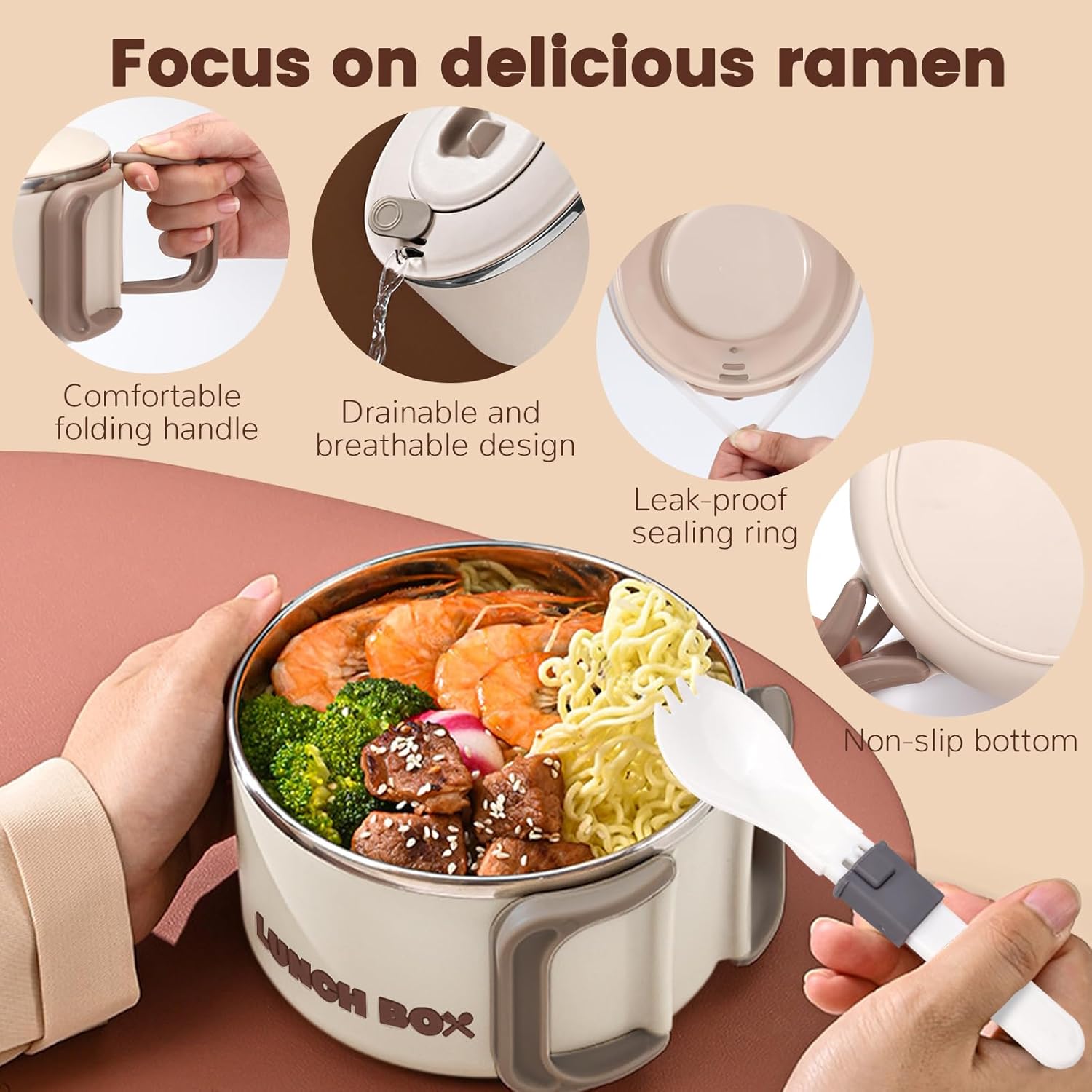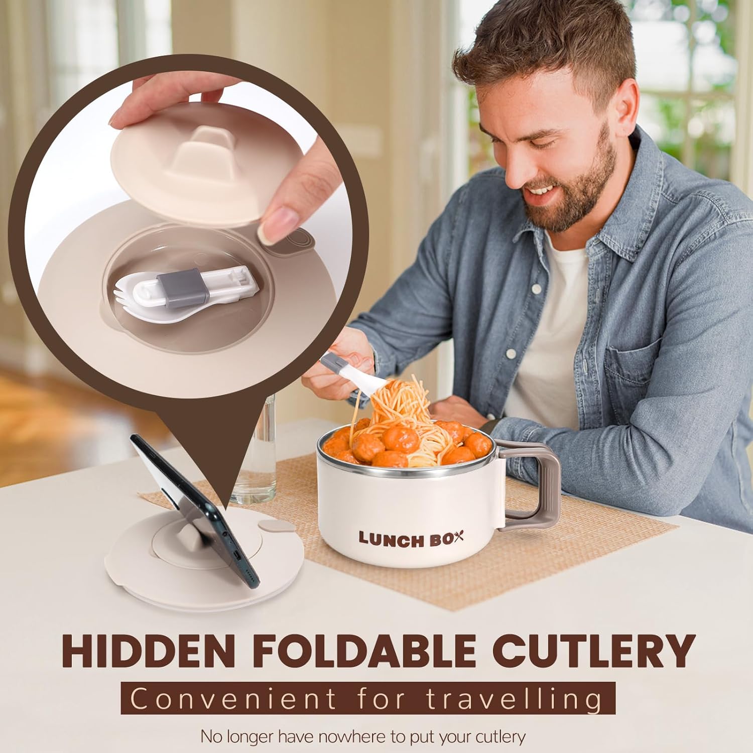 【Foldable Handle & Versatile Lid】 The ramen bowl with lid features a foldable handle for easy carrying. You can drain water through the vent hole on lid top. The small cover holds an equipped spoon. The bracket is for your mobile phone.