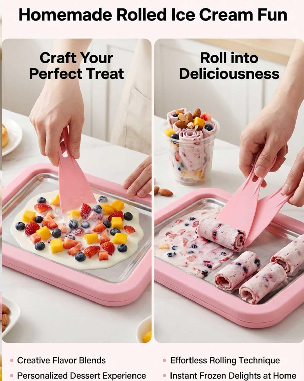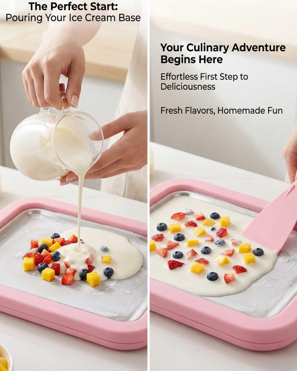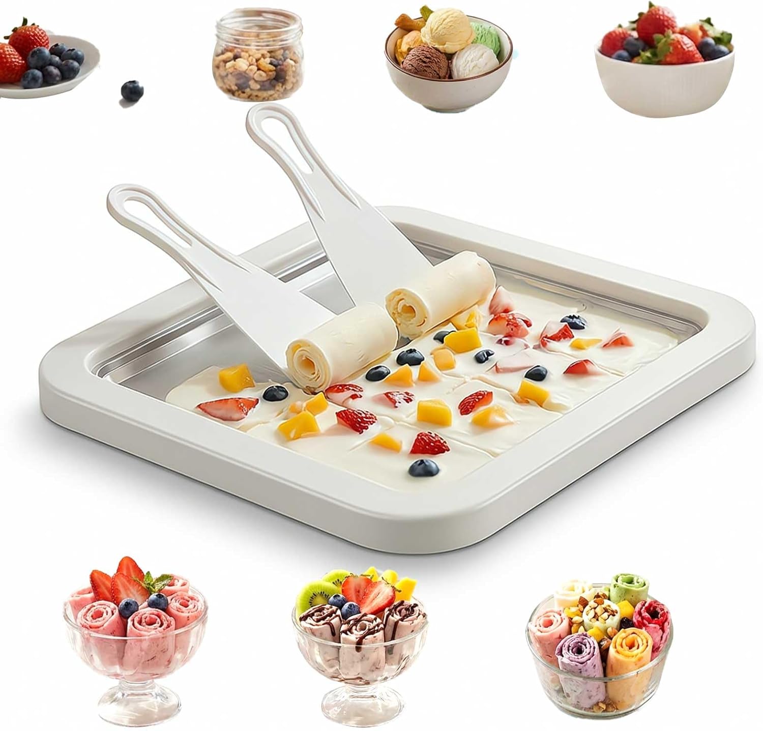 Ice Cream Roll Tray for Home Use Designed for making rolled-style ice cream at home. Can be used with various liquid dessert mixtures such as milk-based or fruit-based recipes. Manual Operation, No Power Needed Requires pre-freezing before use. Pour the prepared mixture onto the cold surface and scrape with the included tools. No electrical components involved. Stainless Steel Freezing Plate Tray is made of stainless steel intended for food contact. The cold surface helps freeze mixtures during preparation for repeated use. Includes Tray and Scrapers Set includes one freezing plate and two scrapers. Tray size is approximately 9 x 7 inches. Suitable for preparing multiple servings in one session. Simple Structure and Cleaning Consists of a flat freezing plate and handheld tools only. Hand wash after use. Compact form allows for standard kitchen storage.