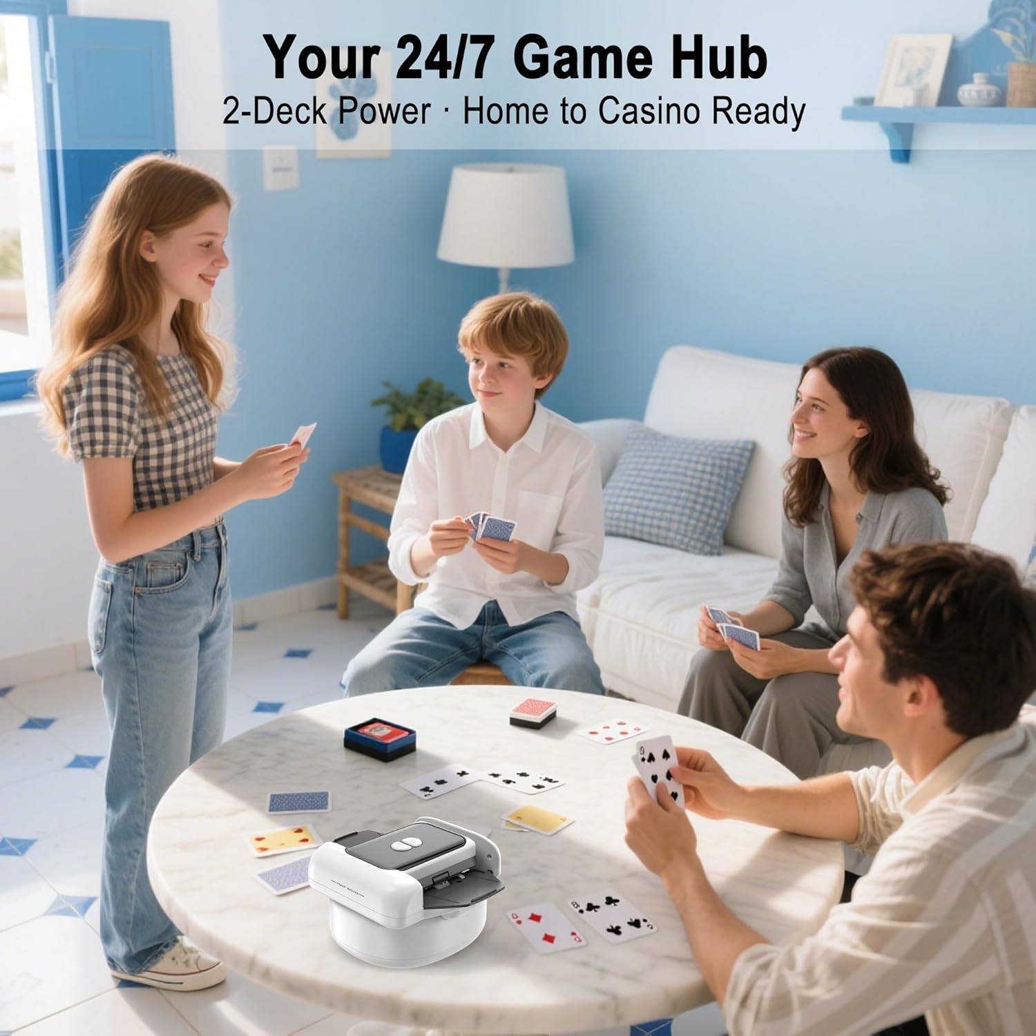YEAR-ROUND GAME NIGHT SAVIOR: Kills manual shuffling 365 days! Auto shuffler for cards delivers 1-press perfection → smart sensors auto-stop → *save 200+ hours/year for actual gameplay*. ANTI-CASINO NOISE TRUST: Forget rattling casino card shufflers! 65dB library-quiet operation → hear bluff tells clearly, even with sleeping kids nearby. SET-AND-FORGET CARD DOMINATION: Playing card shuffler 2 deck swallows poker/UNO in 15 secs → retractable wings auto-adjust → your only focus is winning. YOUR PERSONAL DEALER POWER: Electric poker card shuffler makes YOU the Vegas boss → guests beg: "How’d you get so good?!" (Real testimonial: "Uncle Joe quit cheating!") PORTABLE PARTY UPGRADE: Convenient size fits in backpacks for tailgates/camping. Ideal for multi-player gatherings — friends request it for poker nights.