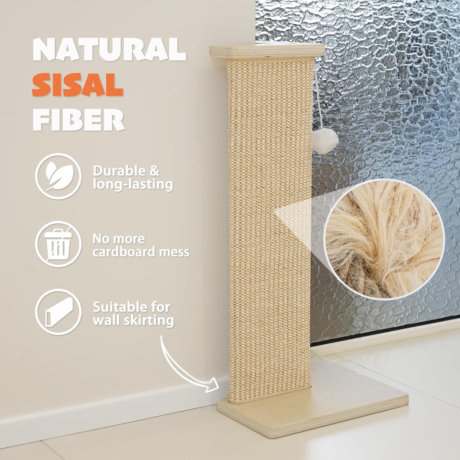 CORNER DESIGN: Specially shaped to snugly fit room corners or furniture edges, providing a convenient and stable vertical scratching space for cats of all sizes. NATURAL SISAL: Wrapped with natural sisal mat that cats love to scratch, helping keep claws healthy and your cat active. STURDY & STABLE BASE: Comes with a wide wooden base and reinforced support to prevent wobbling or tipping—perfect for energetic scratchers. PROTECT FURNITURE: It helps to redirect cat bad behavior and protect your sofa. Use included catnip if your cat ignores the scratcher. EASY CARE & ASSEMBLY: The scratcher comes with stable wooden structure, simply follow the manual to assemble it in 5 minutes.